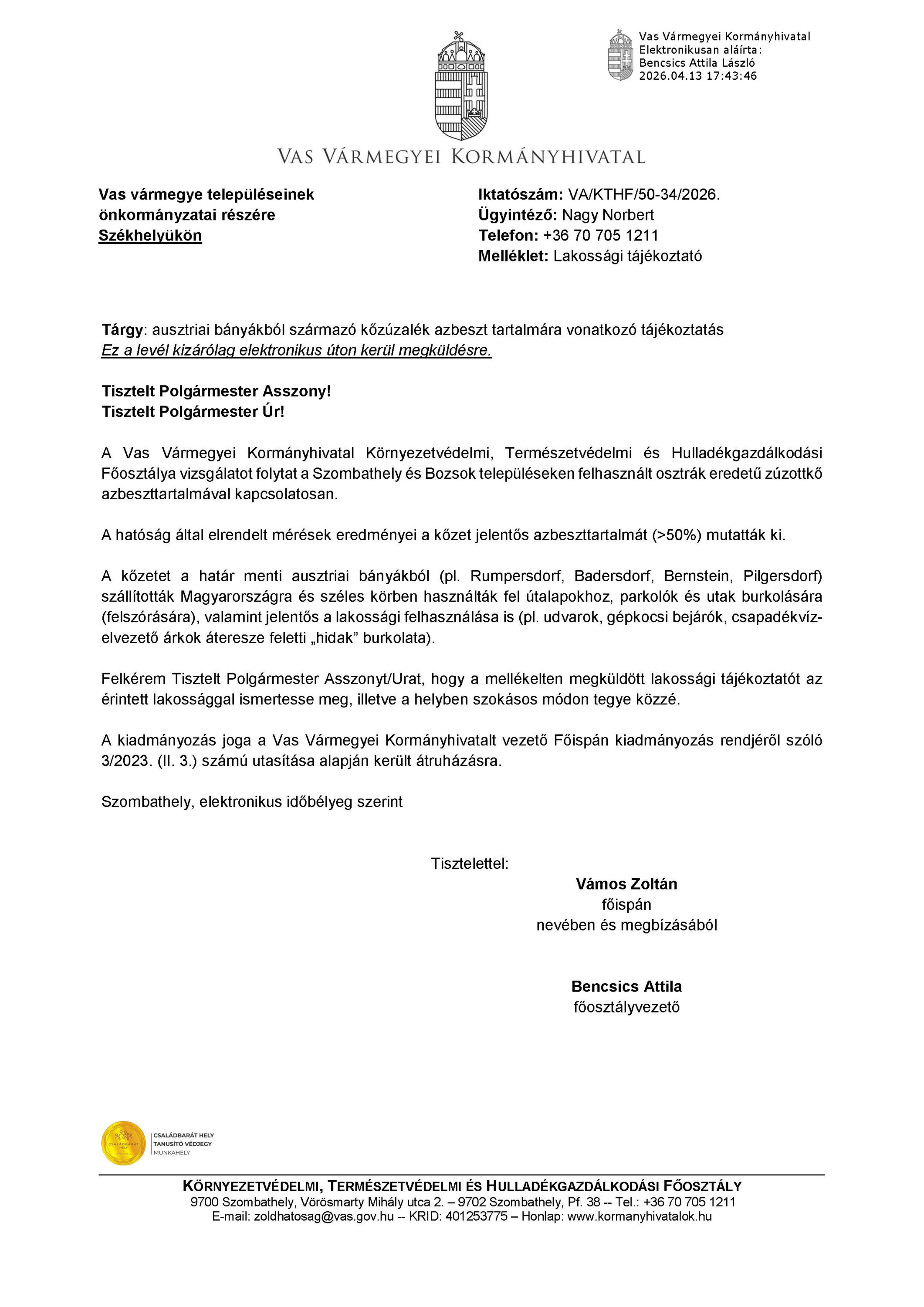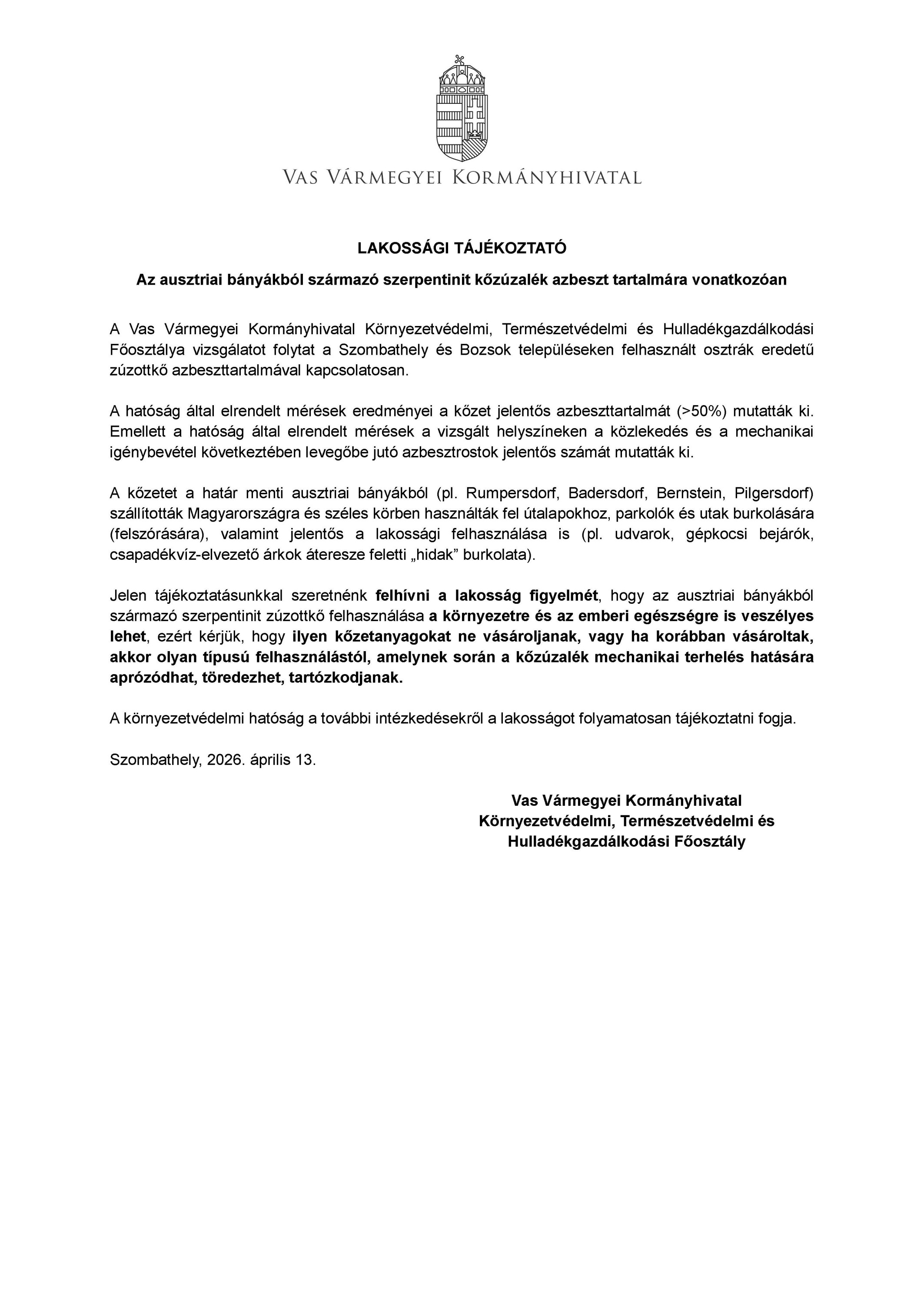 Tájékoztatás azbeszt szennyezéssel kapcsolatban